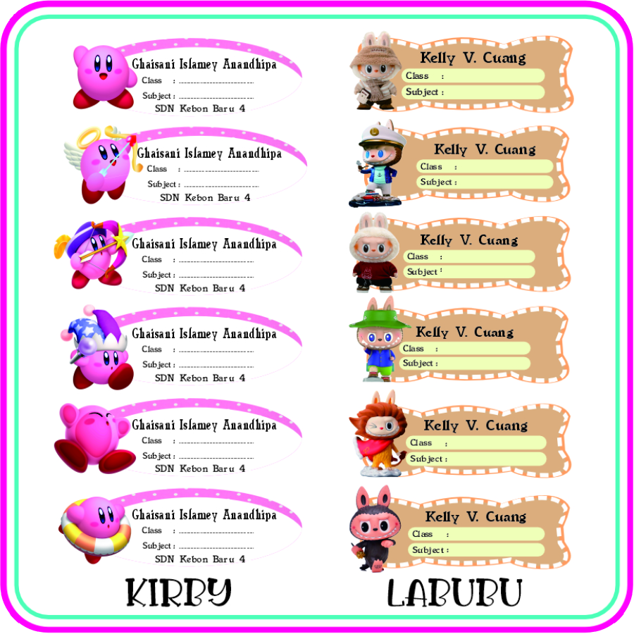 Label dengan ukuran pas untuk buku dan dapat diisi untuk subject dan kelas, dan di cut mengikuti bentuk gambar.