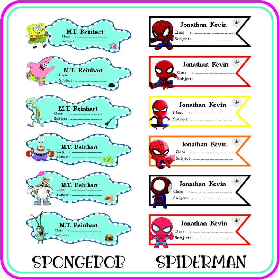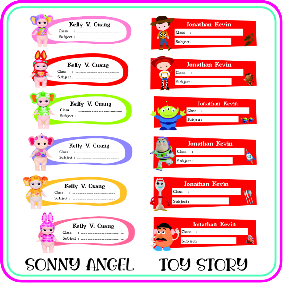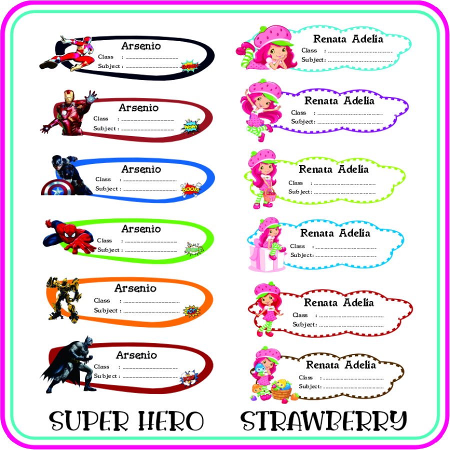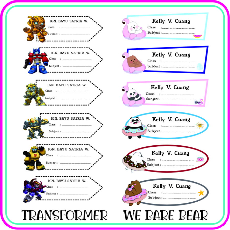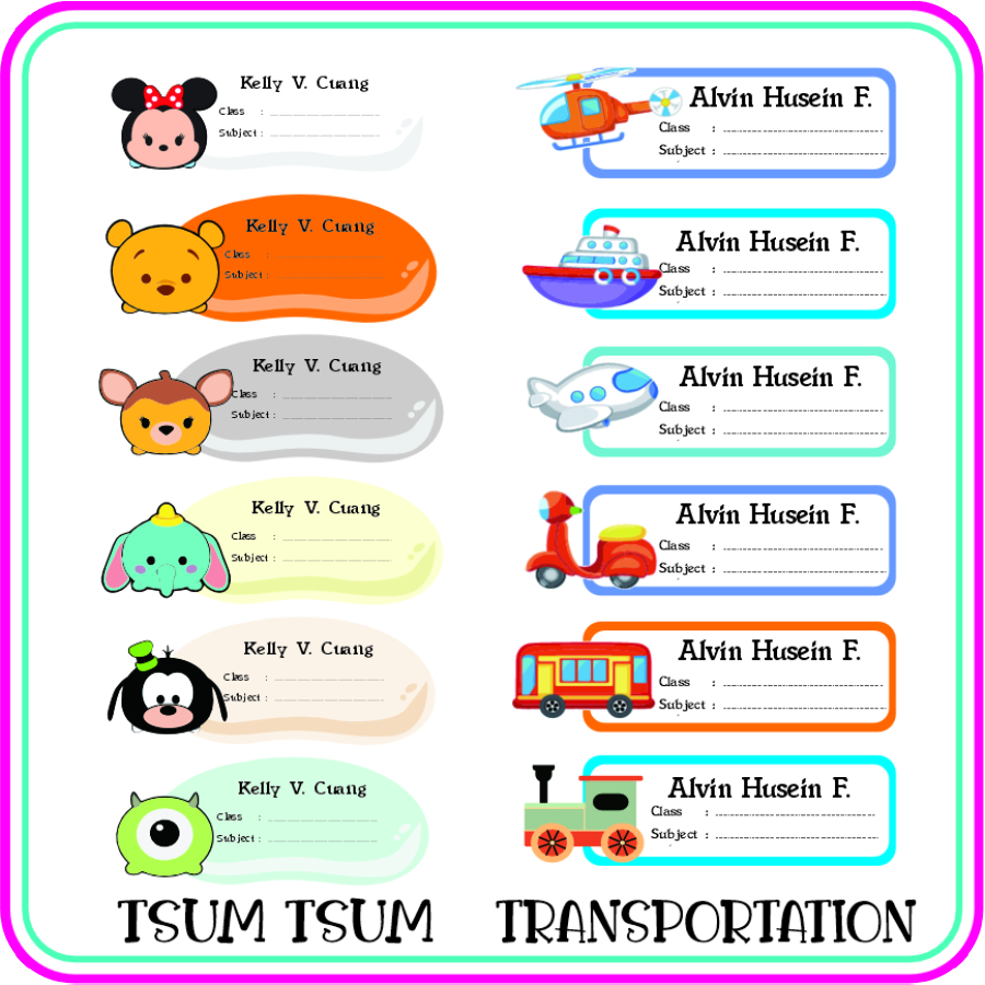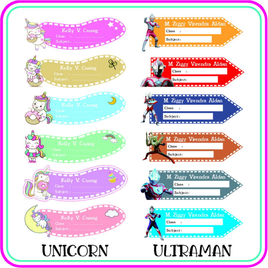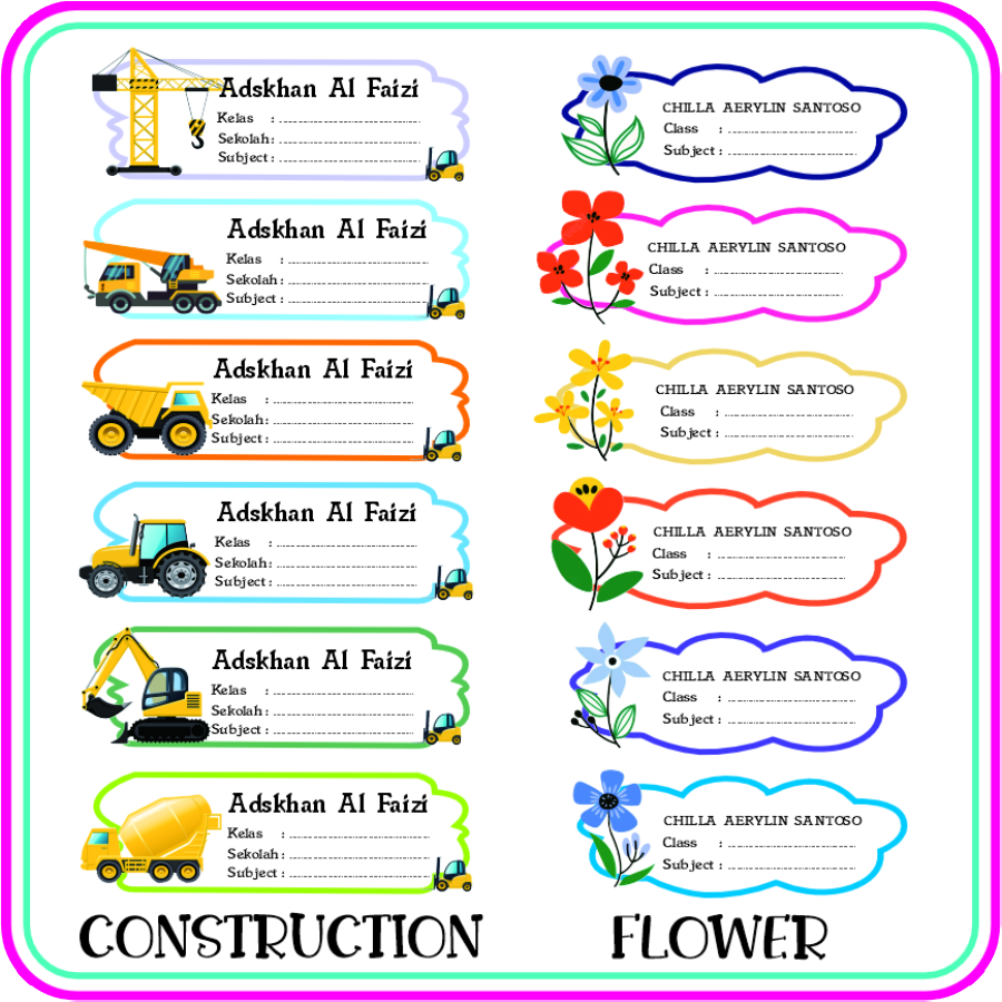 Label dengan ukuran pas untuk buku dan dapat diisi untuk subject dan kelas, dan di cut mengikuti bentuk gambar.